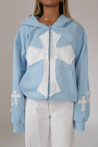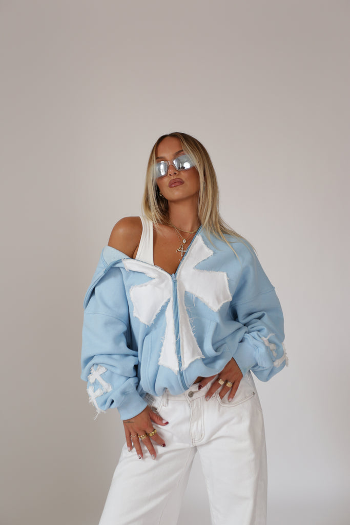 Premium oversized zip hoodie with distressed embroidered denim patchwork. Sustainable streetwear. Boxy fit, drop shoulder, heavy cotton. Plants a tree & removes ocean plastic with every order.